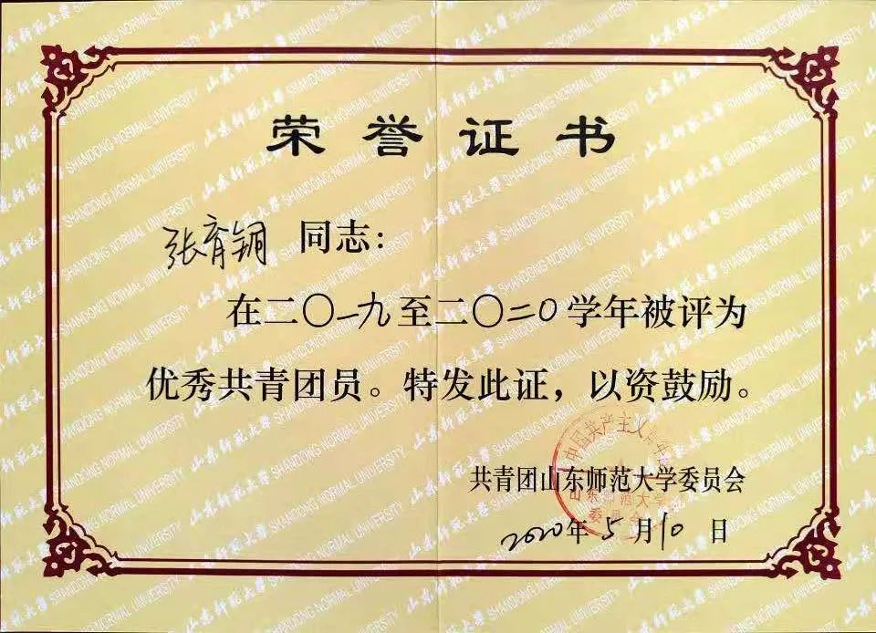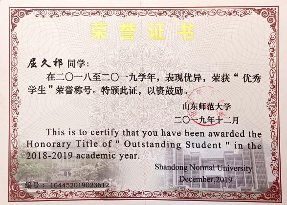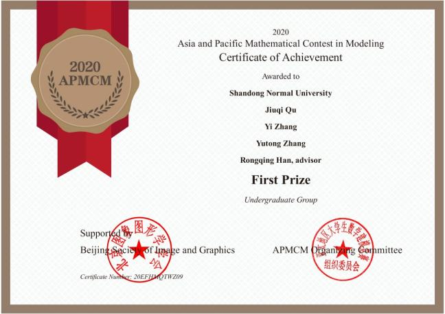 2018级地理科学专业本科生,曾荣获“优秀学生”、“优秀共青团员”等荣誉称号;获校优秀学生一等奖学金一次,校优秀学生三等奖学金两次。全国大学生数学建模山东省一等奖;亚太大学生数学建模竞赛一等奖;山东师范大学2020年“创青春”大学生创业大赛银奖;山东师范大学2019年度省级大学生创新创业项目良好等级;现以专业第二的成绩考研至华中师范大学。