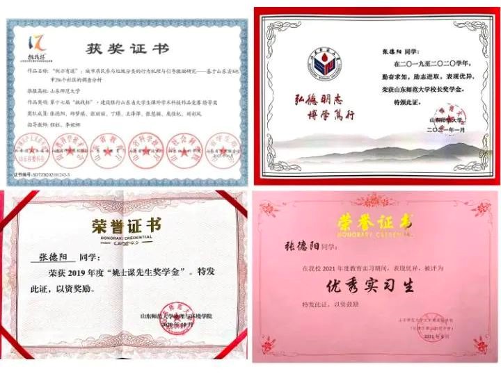 荣获山东师范大学本科生最高荣誉“校长奖学金”、2020年度国家奖学金、地理与环境学院“姚士谋先生奖学金”、连续三年一等奖学金。
