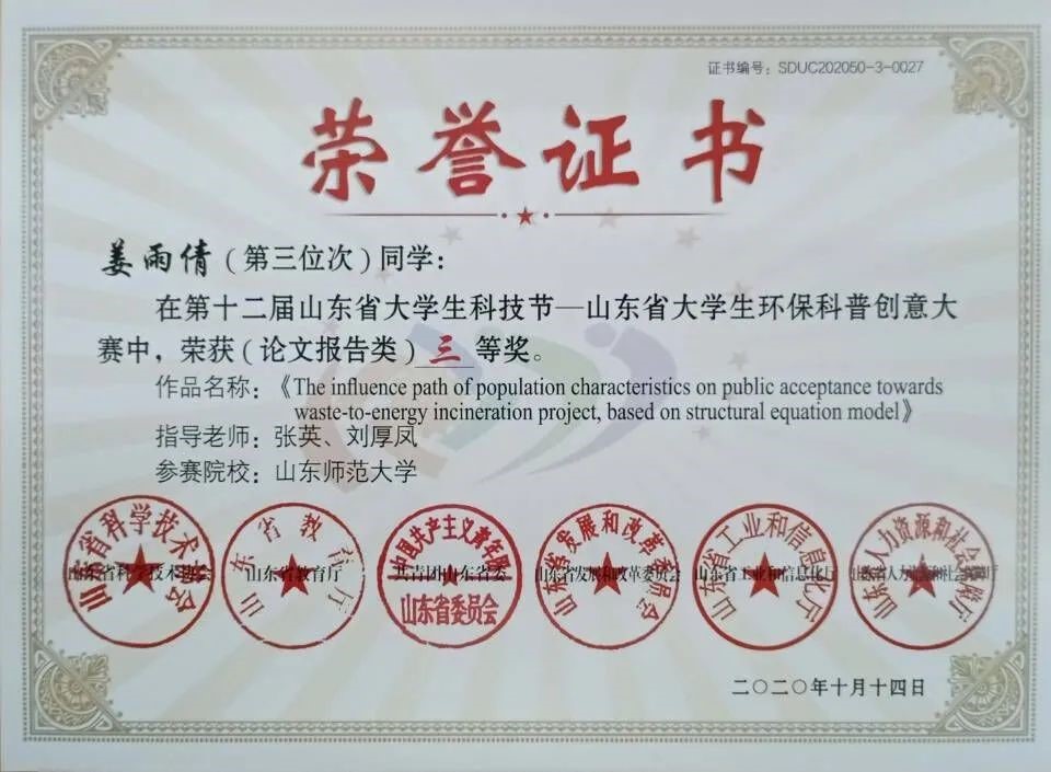 本科期间多次获优秀学生二等奖学金,荣获优秀共青团干部,优秀共青团员称号。参与作品《The influence path of population characteristics on public acceptance towards waste-to-energy incineration project,based on structural equation model》在第十二届山东省大学生科技节——山东省大学生环保科普创意大赛中,荣获(论文报告类)三等奖。