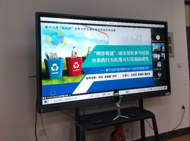 2022年3月24日,我院第十七届“挑战杯”全国大学生课外学术科技作品竞赛国赛线上模拟答辩会于山东师范大学长清湖校区文澜楼G313室举行,本次答辩会由地理与环境学院团委主办,学生会青年发展部承办,党委副书记李山峰、团委书记李妮娜和指导老师程钰、刘莎参加。