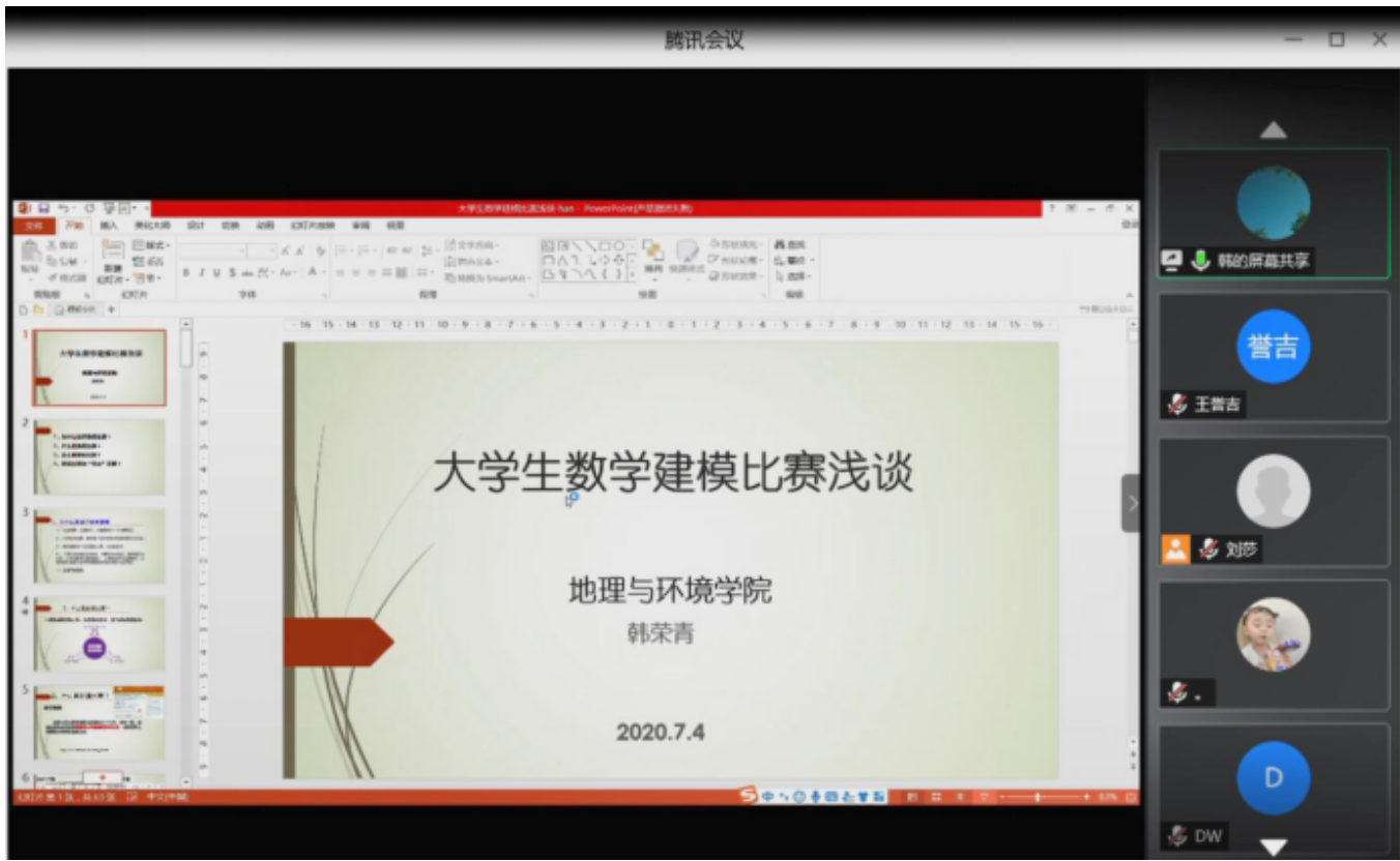 为了加深同学们对数学建模的了解,激发对数学建模大赛的兴趣,地理与环境学院团委、学生会创新创业与竞赛部于2020年7月4日举行了有关“2020年全国大学生数学建模比赛”的动员会。由于疫情防控的原因,本次动员会采取腾讯会议线上分享的形式,为因疫情在家上网课的同学们丰富了原本枯燥的课余生活。本次动员会由张晓青副院长和刘莎老师担任主持人,由韩荣青老师担任主讲人。