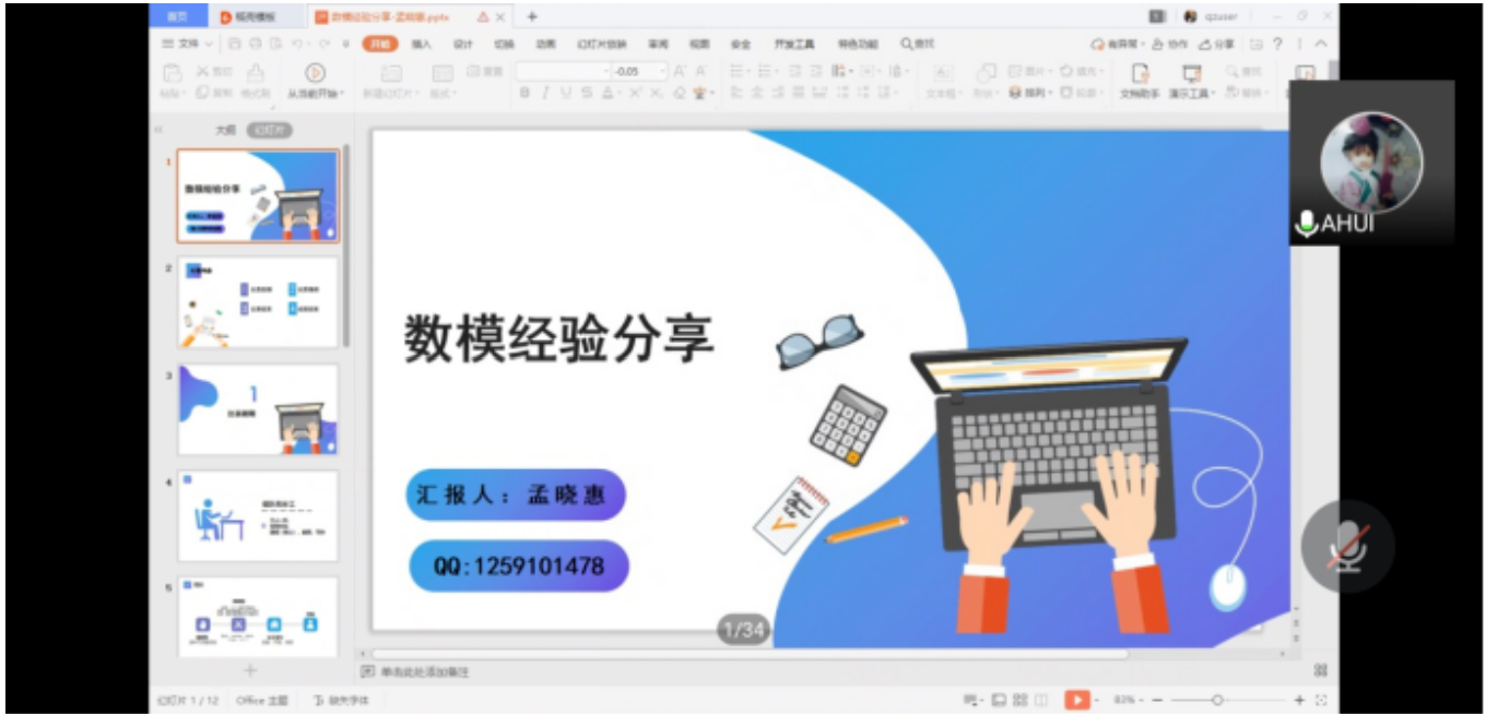 本次讲座邀请了荣获2019年全国大学生数学建模比赛国家级二等奖的孟晓惠师姐和丁杰伟师哥进行比赛经验分享。孟晓惠师姐依次对比赛的前期准备、比赛期间的各种步骤和最终的成绩查询做了详细的讲解。丁杰伟师哥从论文的格式规范、合适字体的选用到应用合适软件进行制图等论文写作技巧做了详细讲解并且传授了有效资料的获取途径。