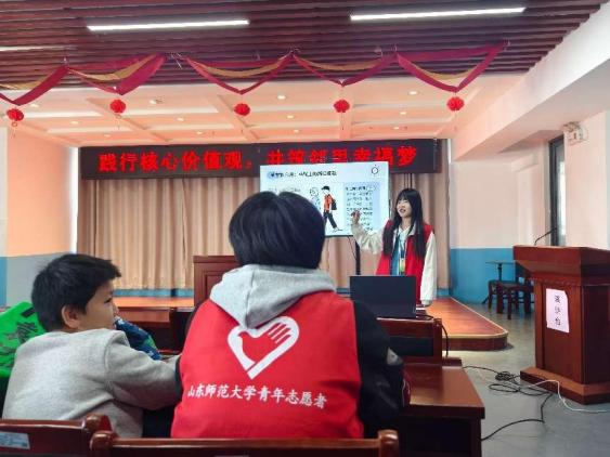 课堂上,志愿者们化身“小老师”,他们结合自己地理科学、环境科学专业所学,创新型设计了“认识家乡地貌”“环保手工制作”等趣味课程,通过图片展示、实物演示、互动游戏等形式,引导孩子们探索自然奥秘,树立环保意识。此外,课堂还融入了交通安全、消防安全、防溺水等科普内容,切实提升孩子们的自我保护能力。
