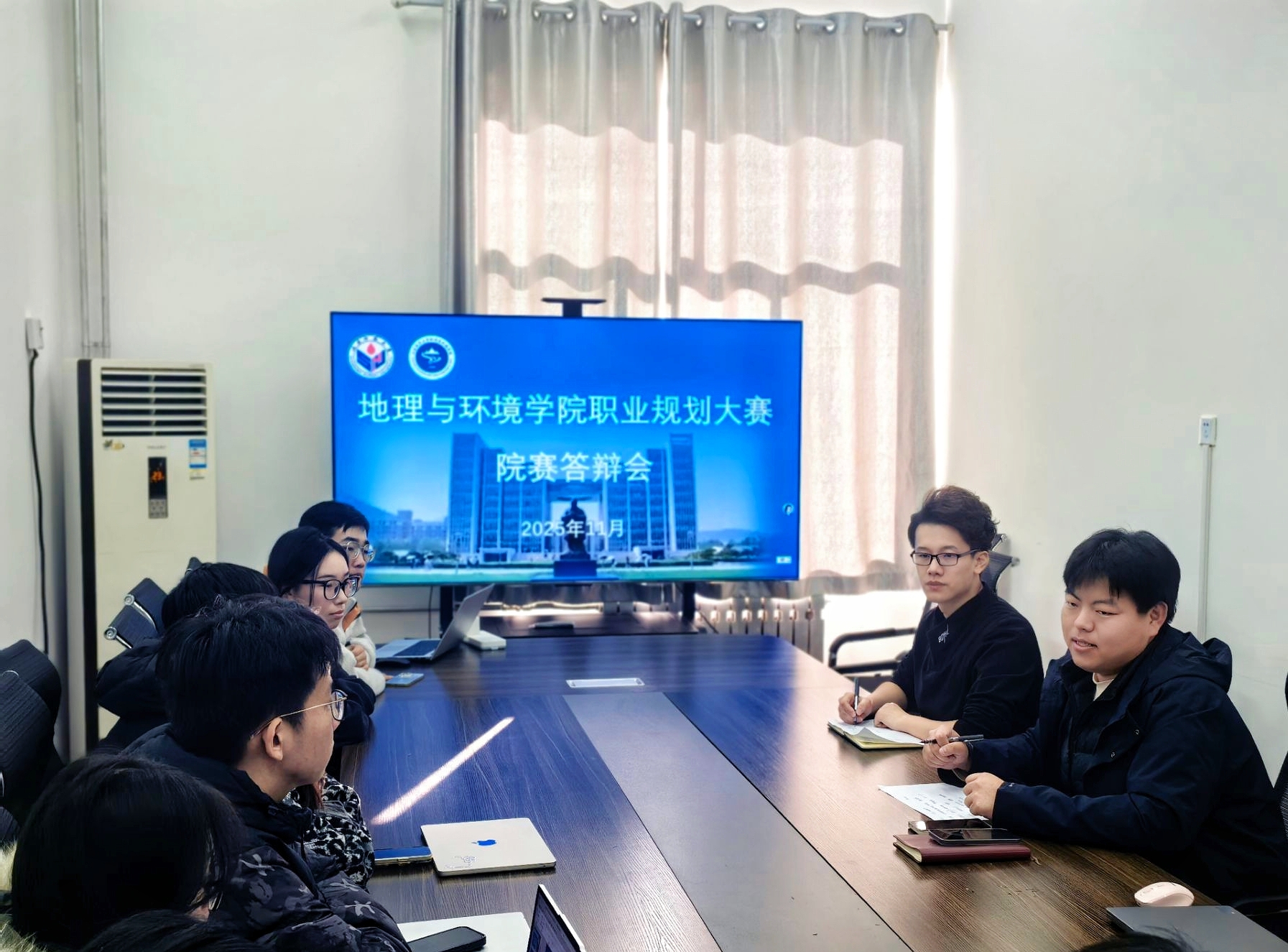 11月25日中午,地理与环境学院于长清湖校区文澜楼A区G317会议室举行2025年全国大学生职业规划大赛(学院赛)答辩会。学院就业工作辅导员、2022级本科生辅导员欧阳德龙,2025级本科生辅导员万凤鸣共同担任本次答辩评委。