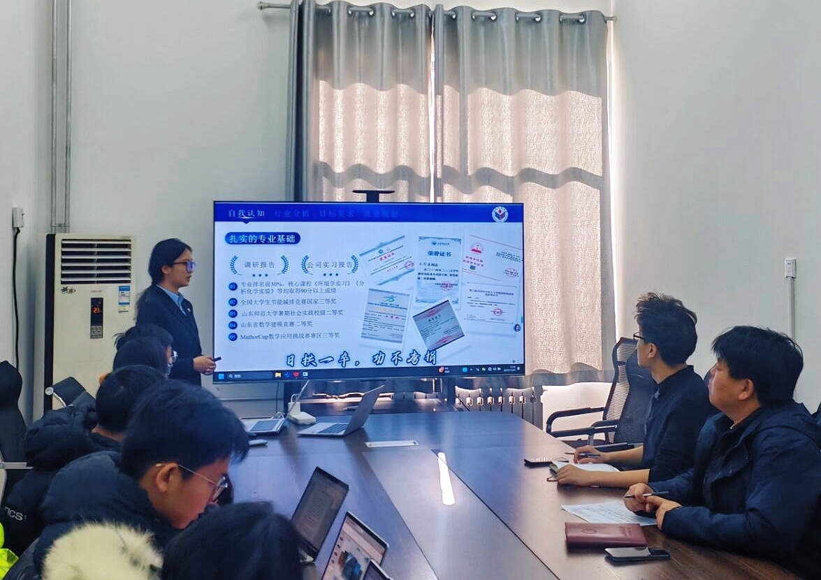 答辩分为个人展示和评委问答两个环节。在个人展示环节,选手们结合自身专业所学和职业规划,通过PPT文稿辅助展示,从自我认知、职业认知、职业决策、计划与路径、动态评估与调整等多个维度,详细擘画了各自的职业规划蓝图。莫雨檬同学结合母亲年轻时在乡村支教经历引出自身职业选择的由来;陈梦泽以大学时光中参与生态环保社会实践的经历,向大家展示了自己希望成为自然保护区工程师的理想;王思嘉将“个人小我”与人与自然和谐共生的中国式现代化建设的“大我事业”紧密结合,表达了努力成长为一名环境影响评价工程师的决心……每名选手的规划不仅立足于个人兴趣与专业特长,更紧密贴合了国家发展战略与行业发展趋势,体现了强烈的时代责任感。欧阳德龙和万凤鸣分别对每位参赛选手的答辩讲解进行了点评和指导。