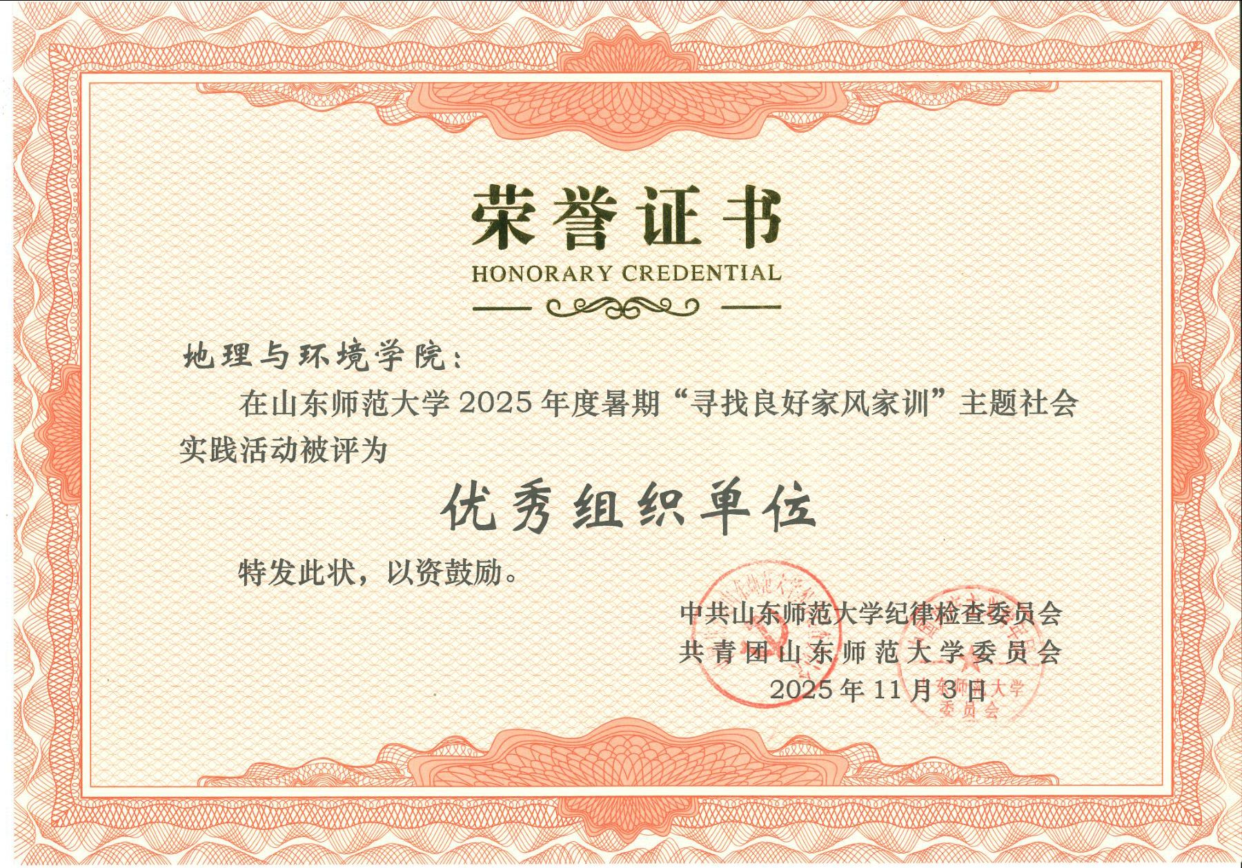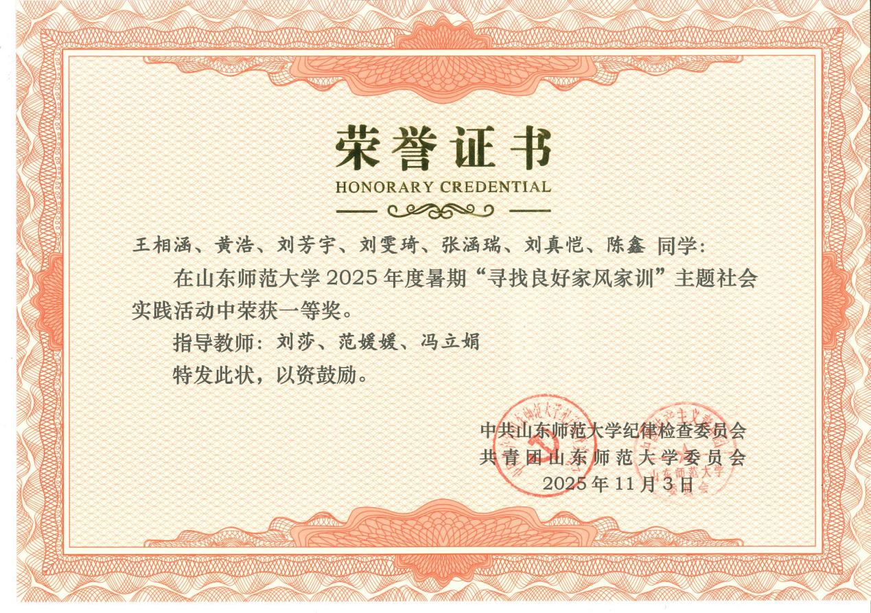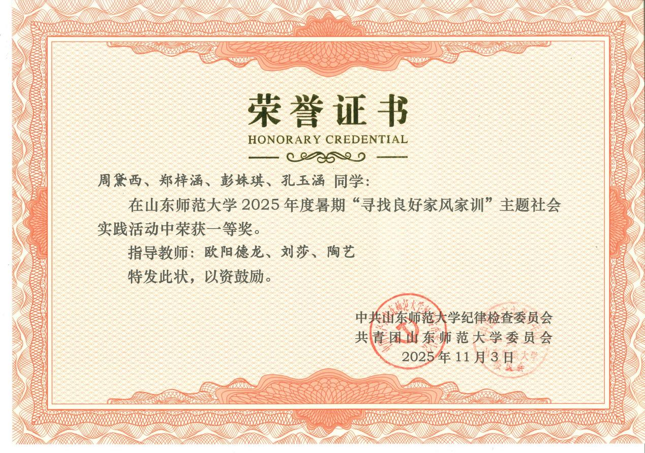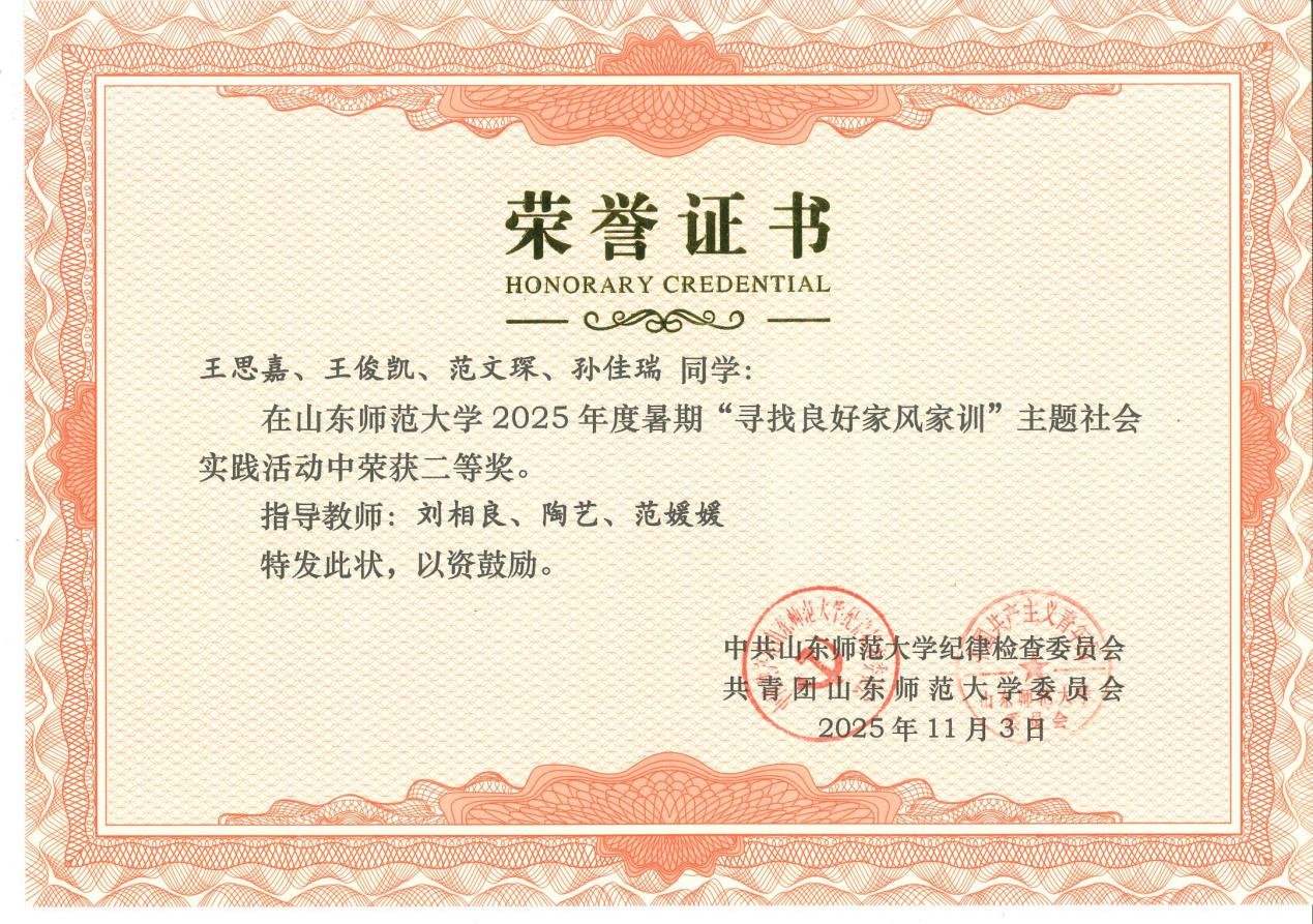 近日,中共山东师范大学纪律检查委员会、共青团山东师范大学委员会联合公布2025年度暑期“寻找良好家风家训”主题社会实践活动获奖结果。地理与环境学院凭借扎实的组织筹备和优异的实践成果,获评“优秀组织单位”,另有2项作品获得一等奖、1项作品获得二等奖,充分展现了学院在廉洁文化建设与实践育人工作中的扎实成效。
