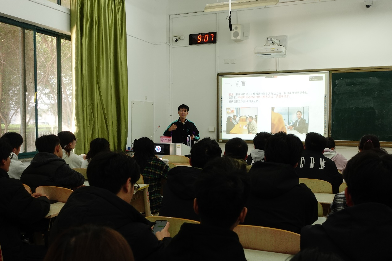 讲座伊始,徐夕博老师便立足学生学业发展核心需求,从就业面试与读研深造两大关键维度,系统阐释了科研能力培养的重要性。他强调,科研经历不仅是学术深造的核心竞争力,更是职场面试中展现综合素养的重要支撑,鼓励同学们主动参与科研实践,积极学习项目中的调研方法、数据处理与技术应用技巧。