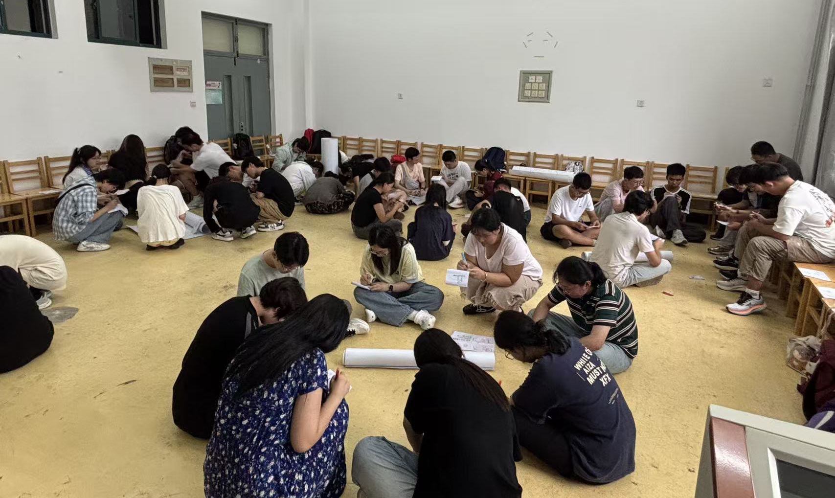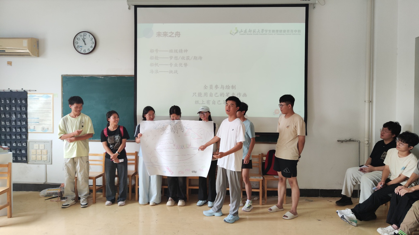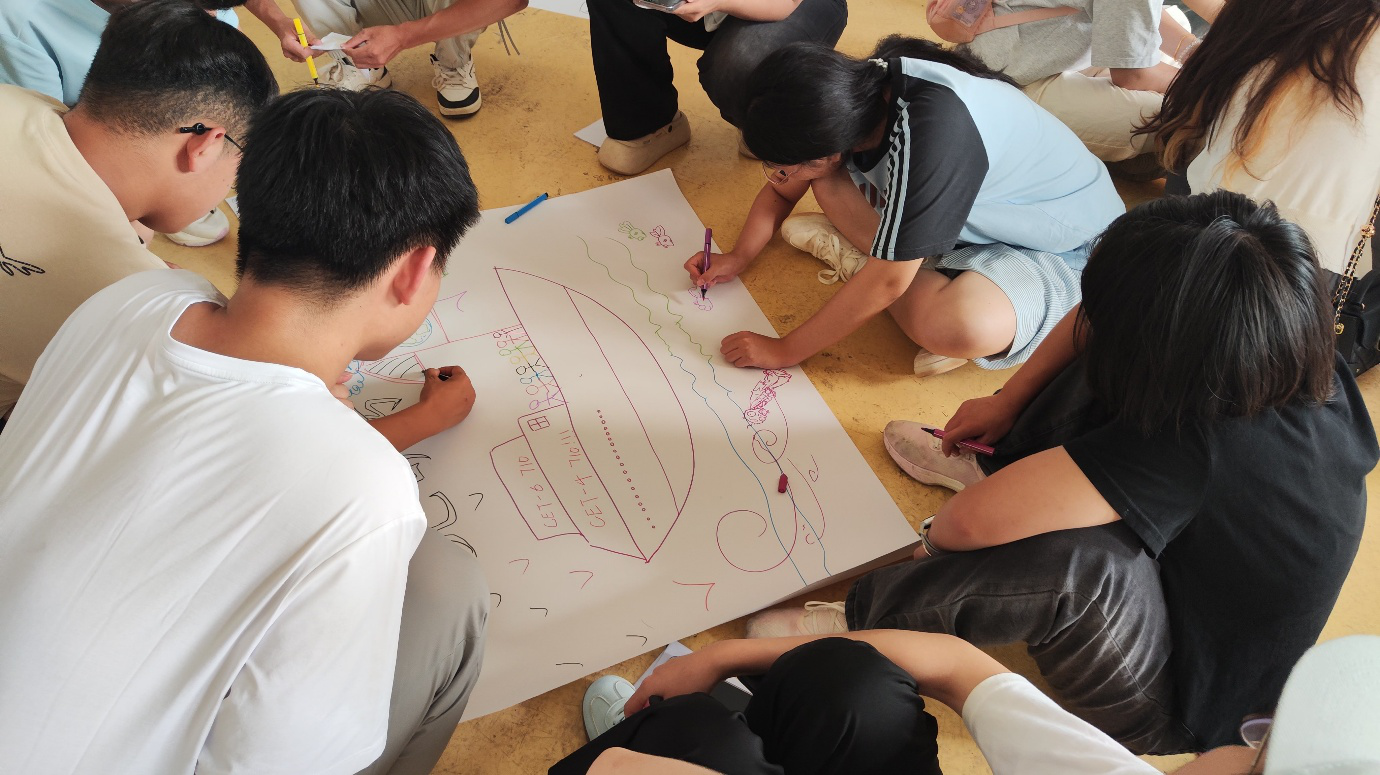 紧接着,“未来之舟”环节拉开帷幕。每个8人小组领取一张大白纸,共同绘制承载班级和大学梦想的航船。十五分钟的创作时间里,同学们分工明确、默契配合:有人勾勒经纬线、森林、湖泊等地理与生态元素,有人选用代表自然的绿色、蓝色、棕色填充画面,有人写下“梦想成真”“万事顺利”等寄语,最后合力完成心目中的未来之舟的绘画。完成后,各组依次上台展示作品并讲解设计理念,从“反气旋号”的命名寓意,到“遥感卫星”图案的设计思路,每一份作品都融入了新生对专业的热爱与对班级的期待,蕴含着地理信息技术监测生态环境的好奇,凝聚着用专业知识守护绿水青山的初心。现场掌声与欢呼声此起彼伏。最后,万老师对各小组作品进行点评,既肯定了同学们的创意与协作力,也对同学们未来大学四年的表现表示殷切期待。