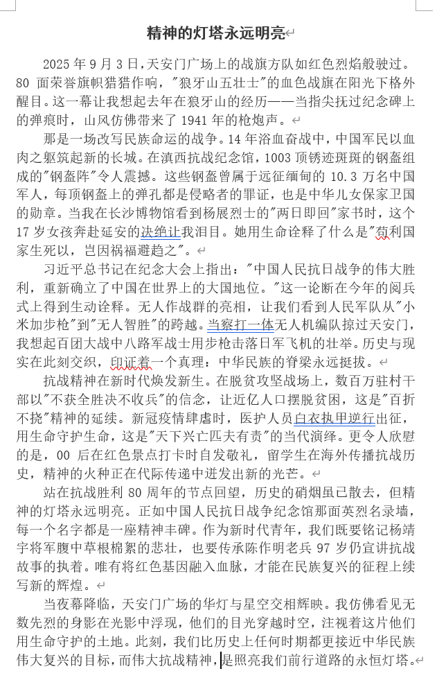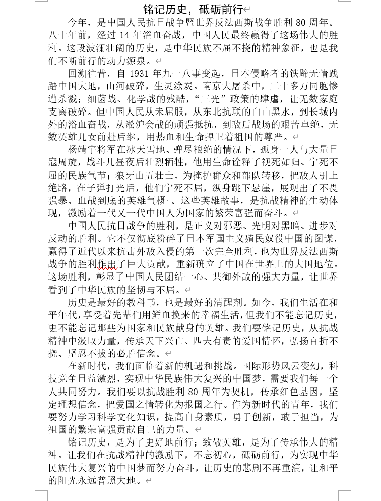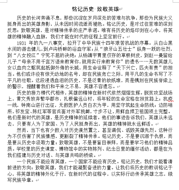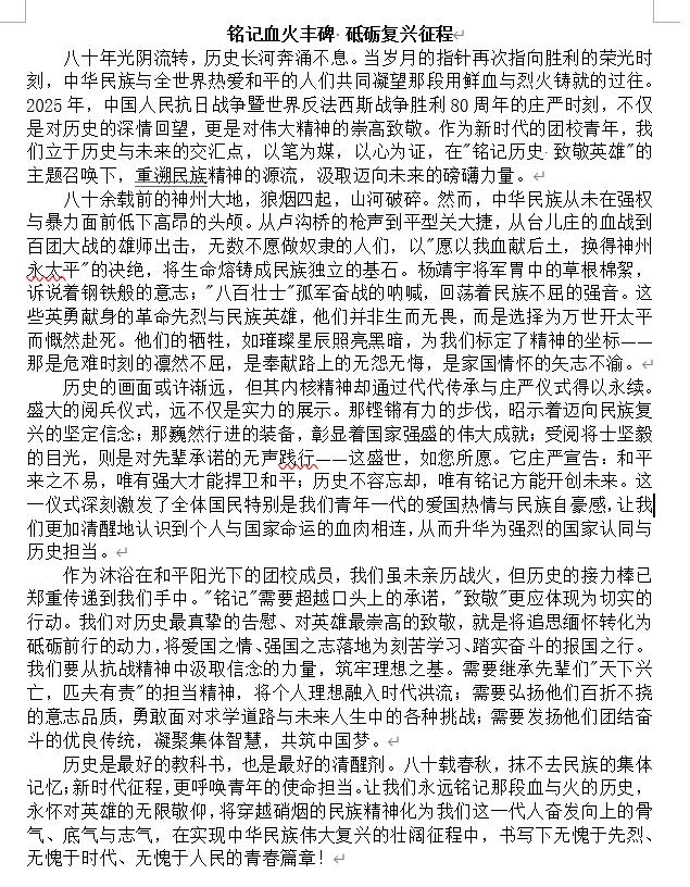 为深入学习贯彻习近平总书记关于铭记历史、缅怀先烈的重要论述,筑牢学生历史认知与英雄情怀,强化青年时代使命意识,地理与环境学院“地心力”团校于九月份组织开展“铭记历史,致敬英雄”主题征文活动,引导学生以文字重温峥嵘岁月、感悟英雄事迹,激发爱国热情与奋斗精神。