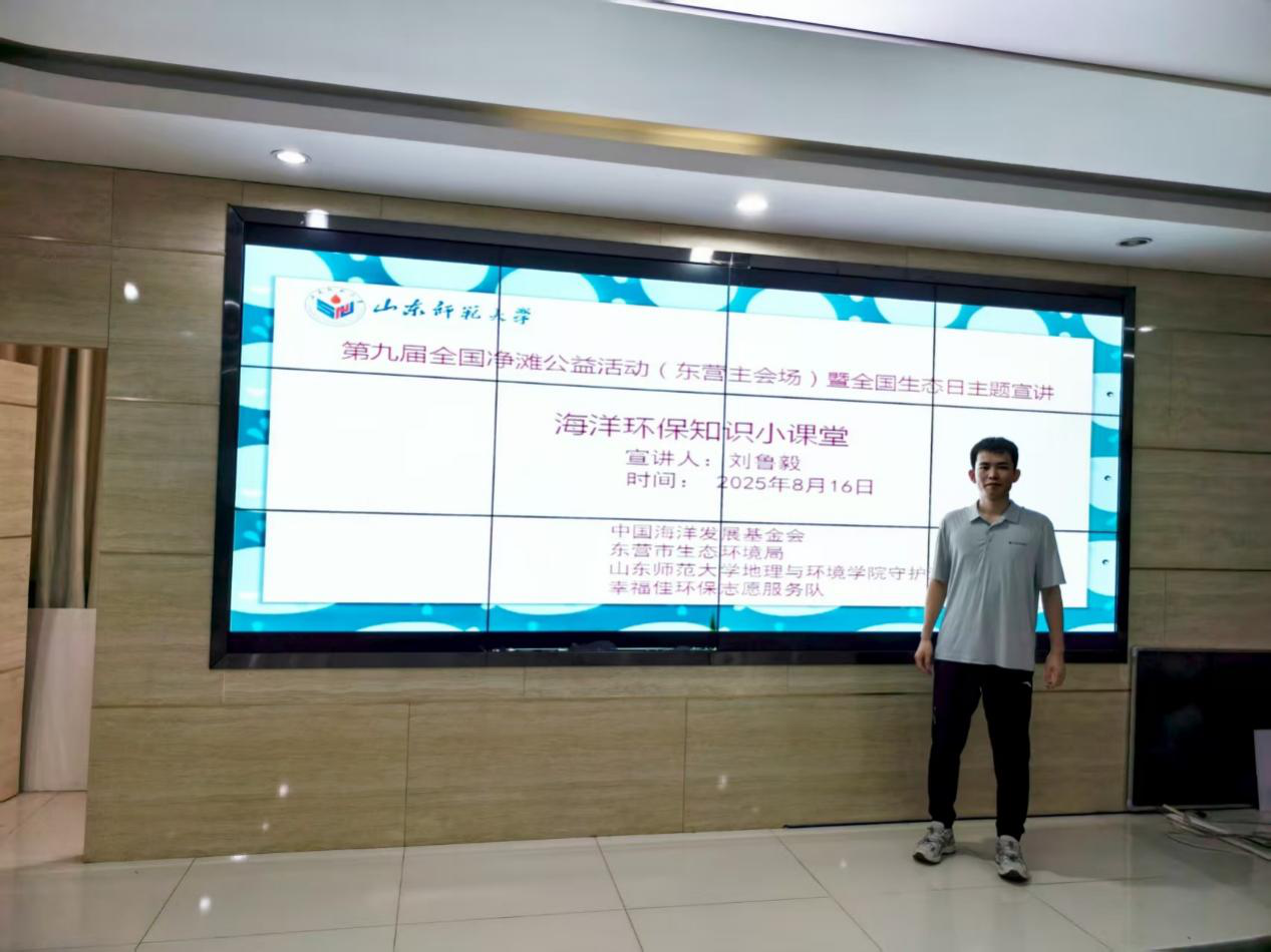 在第三个“全国生态日”到来之际,学院“青春守护美丽河湖”社会实践队走进山东省东营市嵩山社区党群服务中心,以“践行生态文明,守护蔚蓝海岸”为主题,开展“全国生态日”暨第九届全国净滩公益活动主题宣讲社会实践。本次实践活动由我院2025级硕士研究生刘鲁毅担任宣讲人,宣讲活动面向社区中、小学生及居民代表开展。