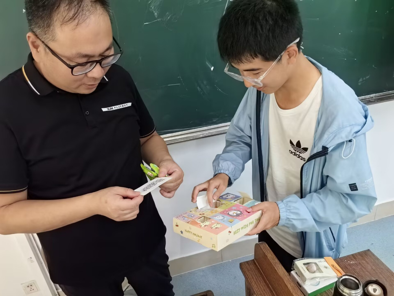 活动现场,教师们领取同学们精心筹备的盲盒礼物。打开盲盒的瞬间,欣慰的笑容绽放在每位教师脸上——一份份惊喜不仅有效舒缓了教师日常教学的压力,更让课堂氛围焕发出轻松愉悦的活力。学生们也主动参与盲盒抽取互动,围绕在教师身边亲切交流,现场欢声笑语不断。暖暖的师情与生谊在轻松融洽的氛围中悄然传递,师生距离进一步拉近,关系愈发和谐紧密。