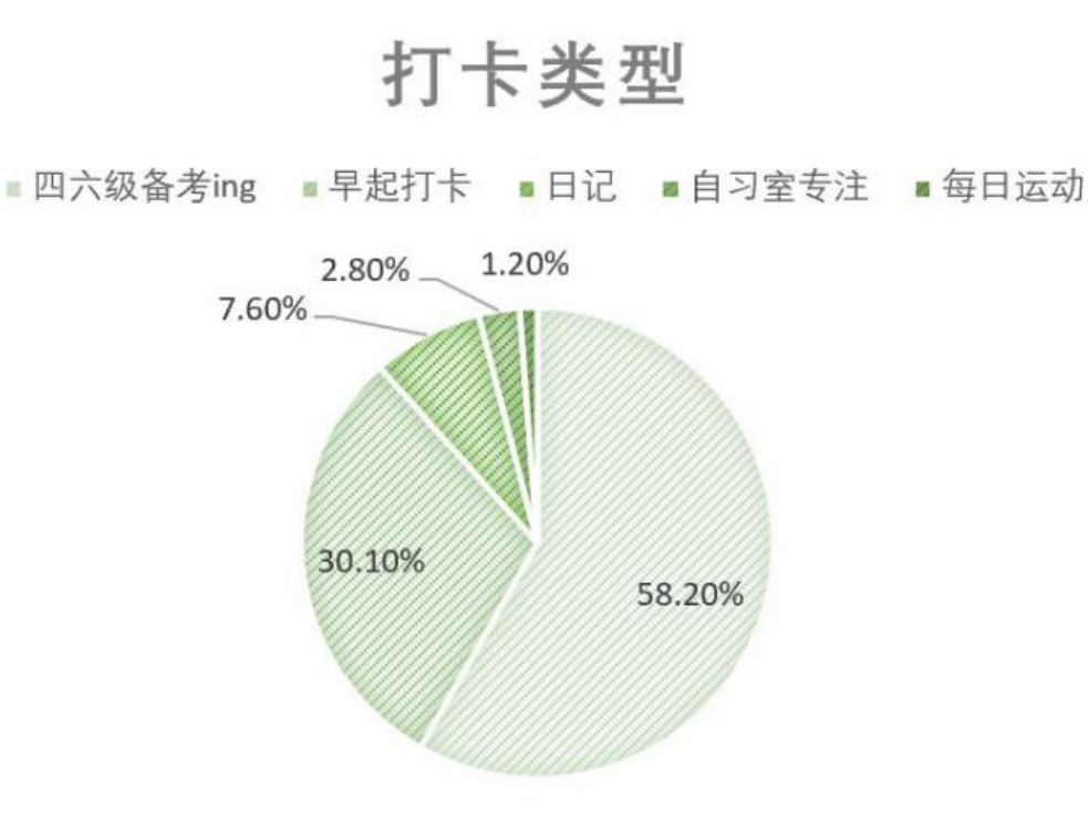 活动开展期间,同学们参与热情高涨。从打卡数据来看,“四六级备考ing”备受青睐,占比达58.2%,充分彰显同学们对学业进步的强烈渴望。同时,早起打卡、写日记等项目也有众多同学踊跃参与,在不同领域努力突破自我。