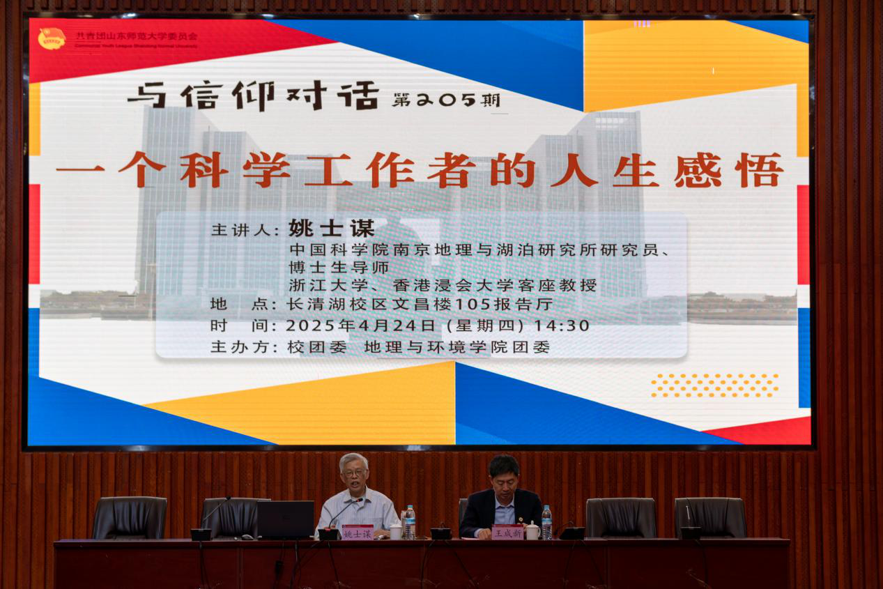 4月24日下午,由校团委与地理与环境学院团委联合举办的第205期“与信仰对话”活动在长清湖校区文昌楼105会议室举行。本次活动特邀中国科学院南京地理与湖泊研究所研究员、著名地理学家姚士谋先生担任主讲,以“一个科学工作者的人生感悟”为主题展开精彩分享。活动由地理与环境学院党委副书记、院长王成新教授主持,吸引了200余名本科生及研究生踊跃参与。