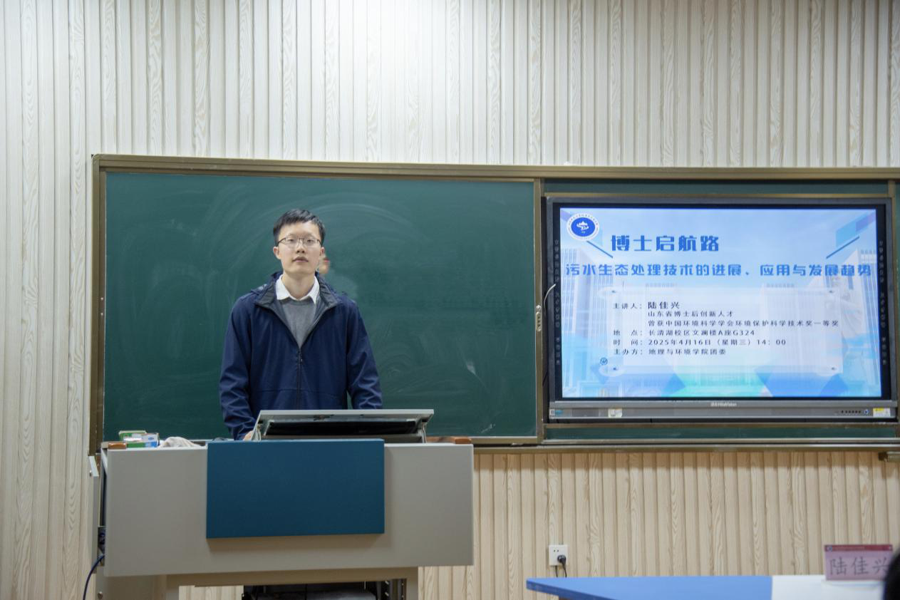 聚焦生态科技前沿,解析学术发展路径。讲座中,陆佳兴围绕“污水生态处理技术进展与应用”及“学术成长经验分享”两大主题展开。他结合国家“双碳”战略背景,系统阐述了传统污水处理厂的碳排放现状,并深入解析了人工湿地技术在生态修复中的创新应用。通过展示“马踏湖人工湿地生态治理”典型案例,陆佳兴详细讲解了人工湿地在氮磷去除、碳汇功能提升及新污染物治理方面的技术突破,为学子们打开了专业研究的新视野。