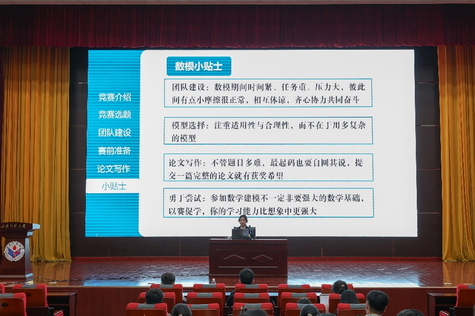 在主题报告环节,高丽惠系统梳理了数学建模赛事体系,重点解析了论文写作的核心要素。她以“标题精准定位 - 摘要凝练表达 - 关键词科学选取 - 正文逻辑构建”为主线,逐项解析了各环节的注意事项,她结合自己丰富的参赛经验,分享了实用小贴士:“数模期间任务艰巨,团队成员要相互体谅,携手奋进;模型选择应重适用性与合理性,而非复杂程度;论文写作要做到自圆其说,完整提交便有获奖希望;即便数学基础不牢,也可勇敢参赛,以赛促学,挖掘自身强大的学习能力。”鼓励大家勇敢迈出步伐,积极尝试。