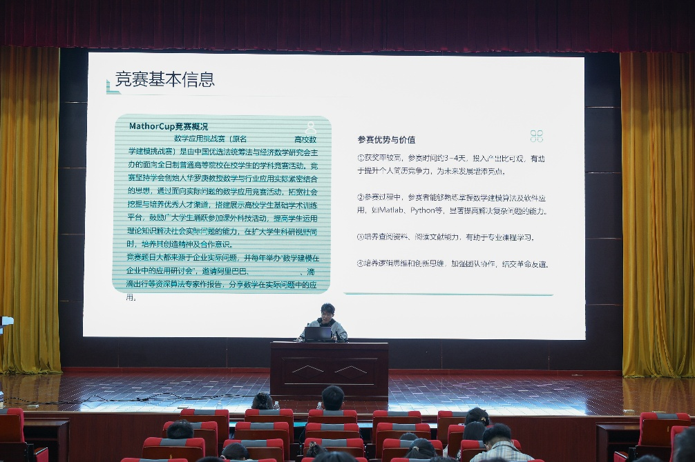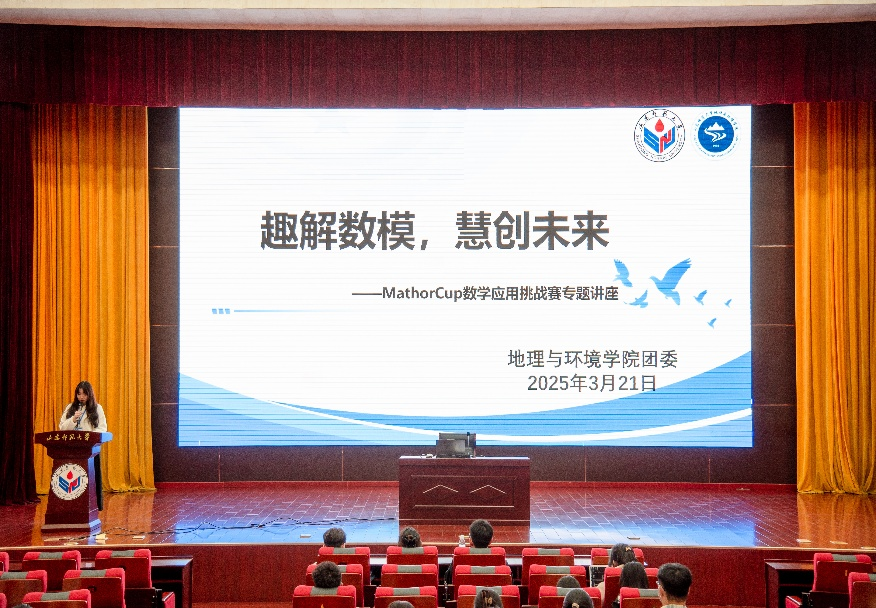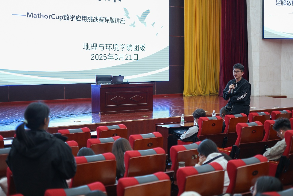 为迎接建校 75 周年华诞,响应学校“双一流”建设“科技创新引领发展”战略部署,3月21日晚,地理与环境学院团委在树蕙堂第一报告厅举办“趣解数模,慧创未来”——MathorCup 数学应用挑战赛专题讲座。活动特邀高丽惠、田晨睿、赖志航三位全国竞赛获奖选手担任主讲,为 200 余名师生带来精彩的建模经验分享。