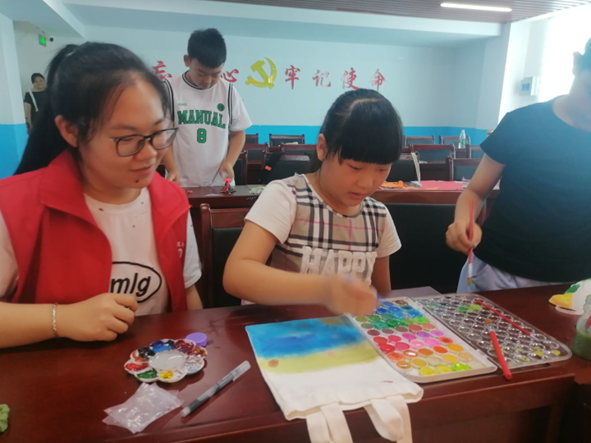 在此次社会实践活动中,服务队紧密结合教育部“双减”工作的要求,实践队成员结合自身特长,以中小学生喜爱的艺术课形式,将环保理念和与艺术创作相结合,助力社区青少年提高环保意识和艺术素养。活动中,实践队员们通过展示生活废弃物制成的精美手工艺品、塑料瓶经加工而成的卡通动物、废弃口罩剪裁而成的精美花束……有效激发了社区青少年对于环保手工课的兴趣,通过带领青少年用手中的画笔画出心中的地球、在白色帆布包上绘出碧海蓝天、用太空泥捏出鲜花绿植等具体的环保文创作品教学内容,既培养了社区青少年的鉴赏能力,也锻炼了动手能力,并且为资源合理化利用提供宝贵思路。