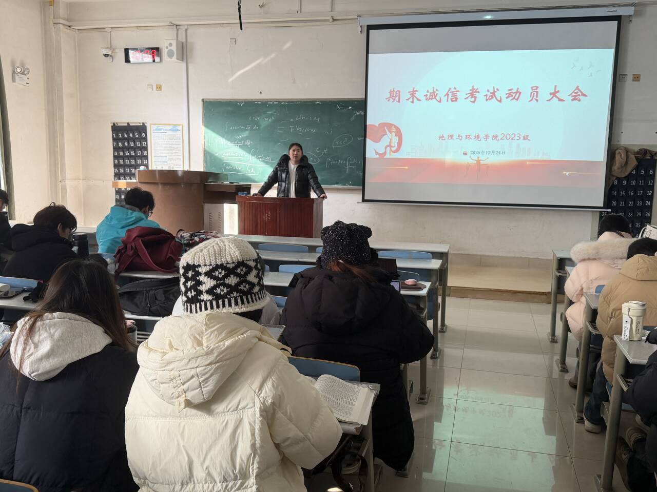 12月23日-29日,地理与环境学院本科各年级于长清湖校区召开诚信考试动员大会,学院副院长程钰和各年级辅导员对同学们开展了诚信教育和考试说明。