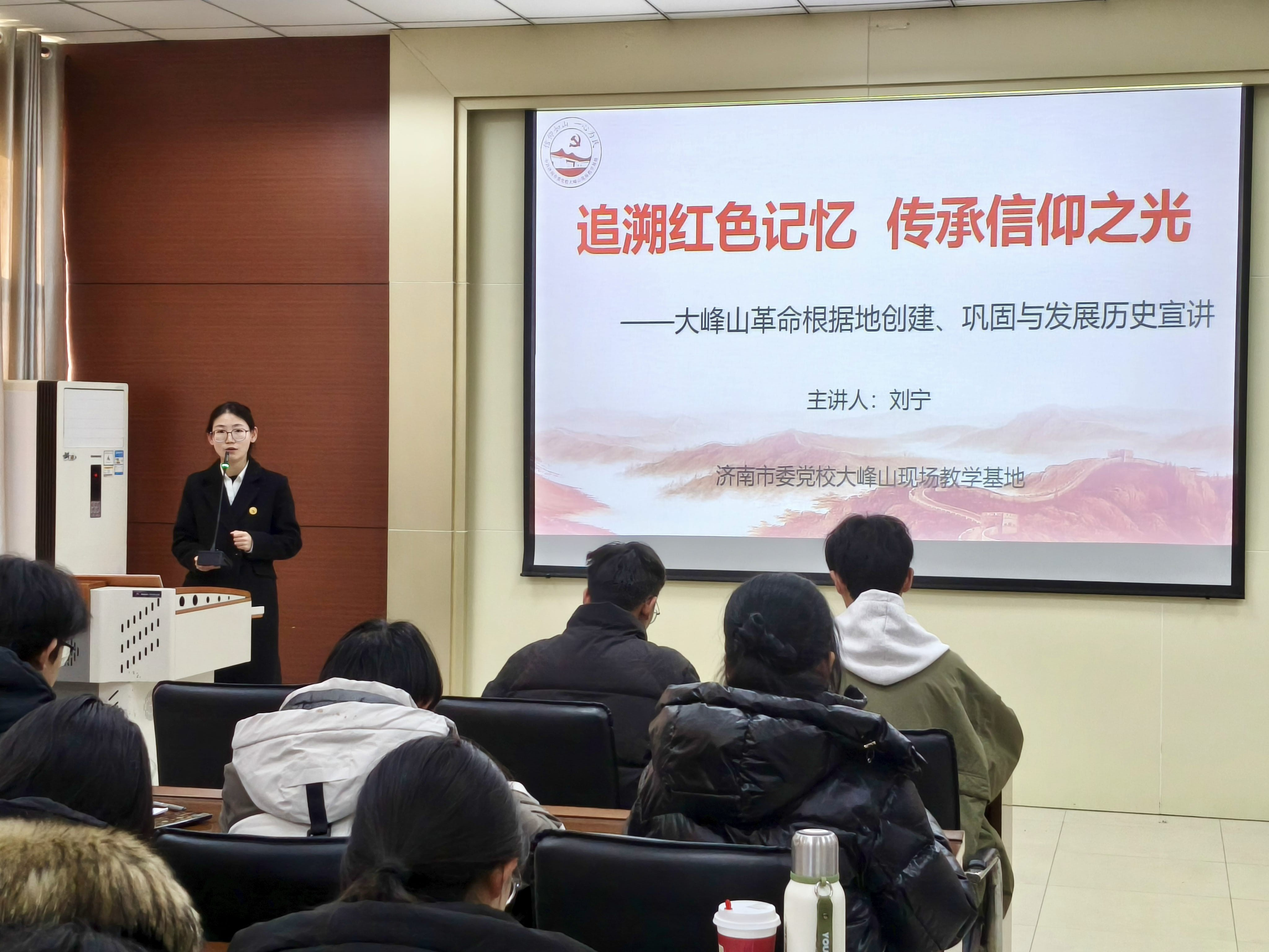 为纪念中国人民抗日战争暨世界反法西斯战争胜利80周年,引导团员青年于红色记忆中感悟初心,厚植家国情怀,12月4日,地理与环境学院“地心力”团校于文澜楼A区G210成功开展“追溯红色记忆 传承信仰之光”宣讲活动。本次活动特邀济南市委党校大峰山现场教学基地刘老师亲临现场,围绕大峰山根据地的创建、巩固与发展,鲜活重现了那段波澜壮阔的革命历程。