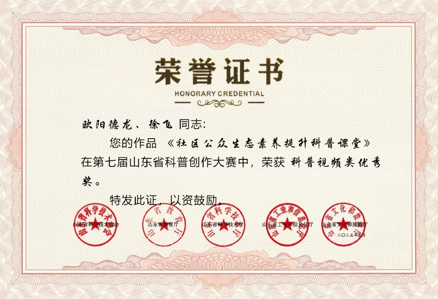 近日,第七届山东省科普创作大赛获奖作品名单公布,我会欧阳德龙、徐飞两位老师的参赛作品《社会公众生态素养提升科普课堂》荣获科普视频类优秀奖。