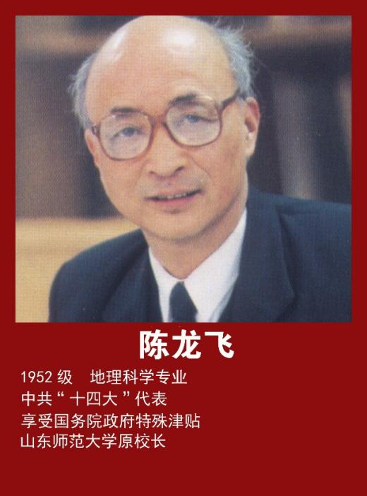 陈龙飞,1952级地理科学专业校友,山东师范大学教授、原校长。中共第十四次全国代表大会代表,享受国务院政府特殊津贴。长期从事人文地理学教学与科研,在区域可持续发展领域贡献突出。主编《山东省经济地理》《中国人口·山东分册》等著作,曾获山东省科技进步奖、社会科学优秀成果奖多项。历任中国教育学会地理教学研究会副理事长、山东地理学会理事长等职,为推动地理学科发展、服务地方规划与生态文明建设发挥了重要作用。