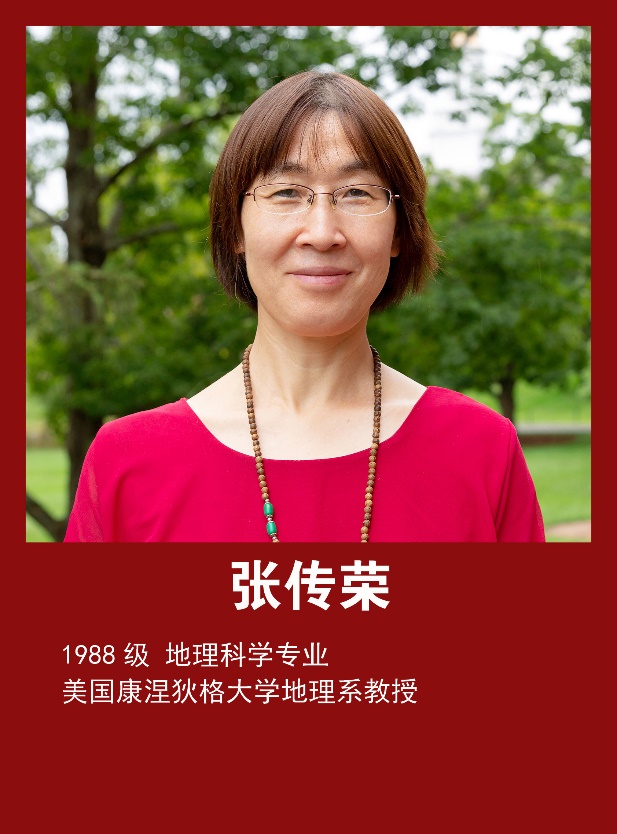 张传荣,1988级地理科学专业,现任教于康涅狄格大学地理系及环境科学与工程中心教授。研究侧重于地理信息科学(GISience)、空间统计和遥感以及它们在土地利用变化、资源与环境评估制图、灾害与交通管理等交叉学科方面的应用。研究团队所提出的新的概念、方法和技术为很多地理现象提供了强有力的工具,并适用于许多领域不同问题的理解,如环境变化,可持续性等。这些地理空间技术在监测、分析及预警21世纪地球所面临的变化方面有着重要潜力。自2003年以来,在GIS、地理、遥感、土壤及环境研究等主流期刊上发表近200篇SCI期刊论文,书刊章节以及会议文集论文。