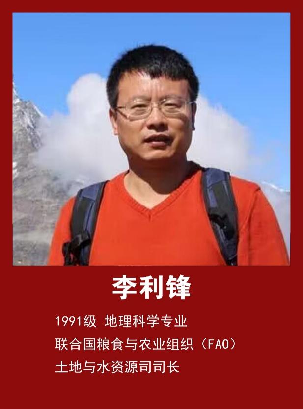 李利锋,1991级地理科学专业,联合国粮食与农业组织(FAO)土地与水资源司司长,兼任粮农组织实施《联合国防治沙漠化公约》与《国际湿地公约》的联络人,与粮农组织和联合国环境规划署的高级专家共同领导“联合国生态系统恢复十年(2021—2030)”。在多个国际会议上发表演讲,分享粮农组织在解决未来土地和水资源风险的管理和保护上的方案和努力。曾任世界自然基金会(中国)淡水与海洋项目协调员、项目官员和项目总监,世界自然基金会(总部)全球淡水项目总监,湿地国际首席项目官及绿色气候基金国家项目计划司协调员(副司级)。