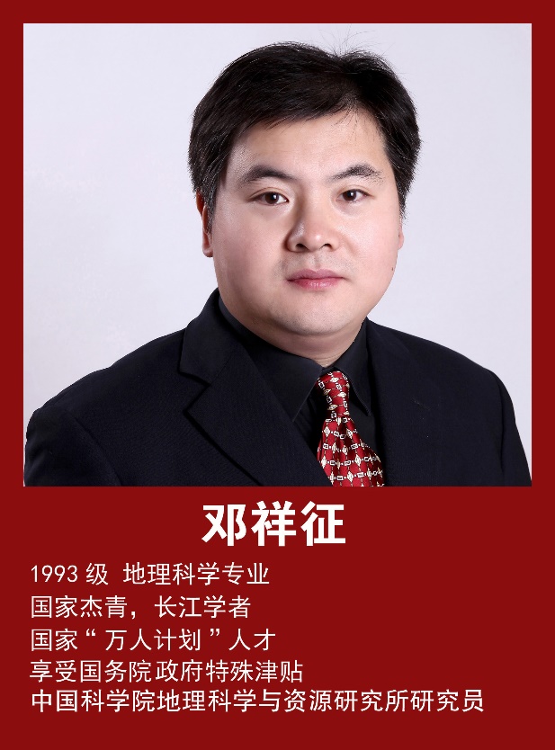 邓祥征,1993级地理科学专业,国家杰青,长江学者,国家“万人计划”人才,现任北京工商大学党委常委、副校长。先后从国内外获得地图学与地理信息系统、环境经济学博士学位,从事资源管理与政策、陆表环境管理与治理、全球变化与区域发展等研究。发表论文350余篇,被引用1.8万余次,多次入选“全球高被引科学家”,入选2023年全球前2%顶尖科学家榜单和“终身科学影响力排行榜”。国家自然科学基金委创新研究群体项目负责人、国家重点研发计划项目负责人,主持国家基金委重大研究计划等项目及课题40余项。