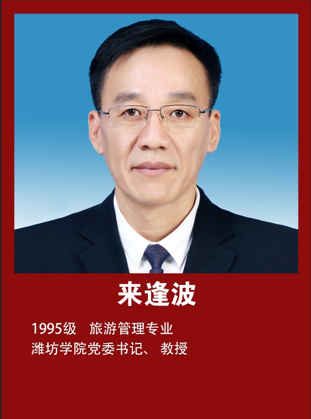 来逢波,1995级旅游管理专业,享受国务院政府特殊津贴专家,现任潍坊学院党委书记、山东省交通运输与区域发展研究中心主任,兼任黄河流域交通运输协同创新中心主任、山东省智慧交通重点实验室首席科学家。主要从事综合交通网络与区域经济研究,主持国家社科基金项目2项、省部级科研项目30余项,2024年获批山东省决策咨询重点研究项目及"十五五"规划前期研究重大课题。发表论文100余篇,出版专著5部,主编出版教材6部。获山东省科技进步一等奖、山东省人民政府决策咨询奖二等奖等奖励23次。